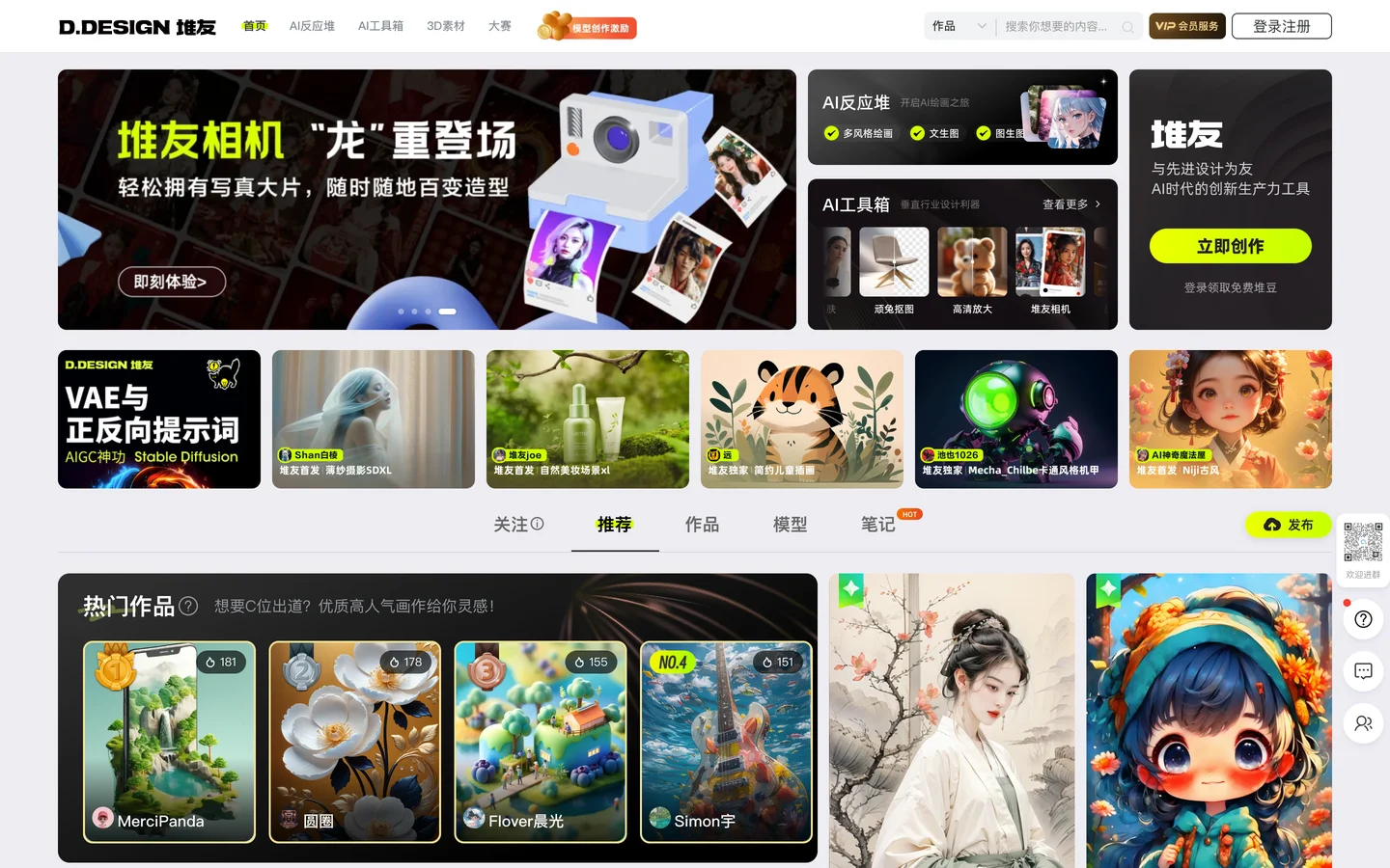 堆友是由阿里出品的一站式AI设计平台,堪称零门槛上手的Midjourney国产平替,在线可体验专业AI绘画工具及上千款AI风格模型和近万个免费可商用的3D素材,是“适合中国宝宝体质”的AI神器。堆友已汇聚超50万AI创作者、设计师,平台日均生成10万张AI作品,并承办多类专业设计赛事活动,成为国内领先的AI设计平台。