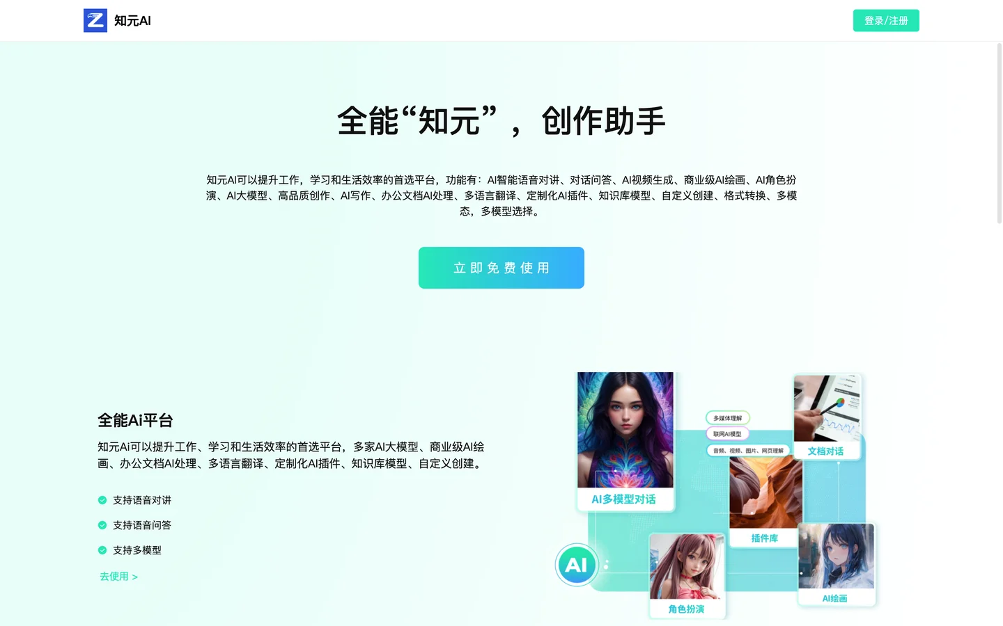 知元AI可以提升工作、学习和生活效率的首选平台,AI智能语音对讲, 对话问答,AI视频生成,商业级AI绘画,AI角色扮演,AI大模型,高品质创作写作办公文档AI处理、多语言翻译、定制化AI插件、知识库模型、自定义创建,支持Windows和MacOs系统,电脑PC端,手机H5端,微信小程序及公众号,安卓手机APP,苹果手机APP等多应用。